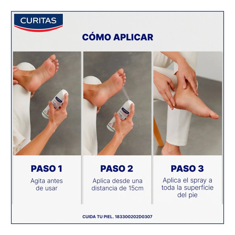 - Ideal para aplicar por la mañana, después de la higiene de los pies, agitar antes de usar y rociar a una distancia de 15 cm.
