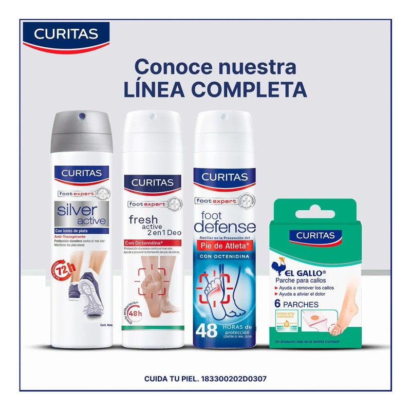 Desodorante para pies Curitas Fresh Active 2 en 1 Deo ofrece protección duradera contra el mal olor con su efecto antibacterial.