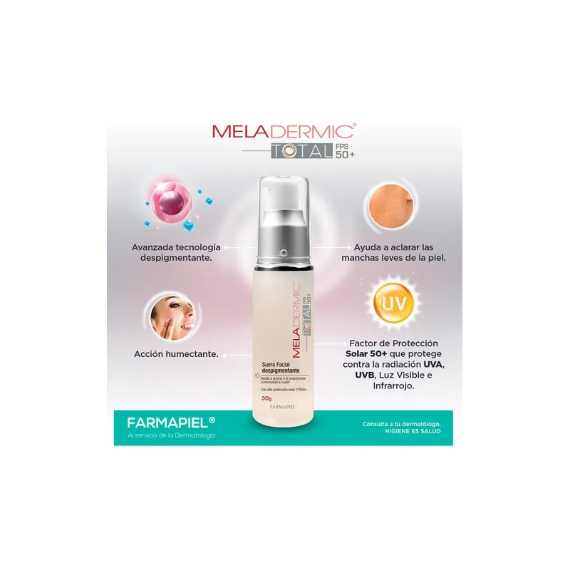 Suero facial despigmentante y protector solar, el cual contribuye a devolver al rostro su tono natural, gracias a su fórmula. Serum facial MELADERMIC TOTAL con Factor de Protección Solar 50+ (FPS) ayuda a aclarar las manchas, actúa contra el fotodaño y fotoenvejecimiento prematuro.