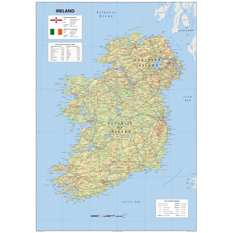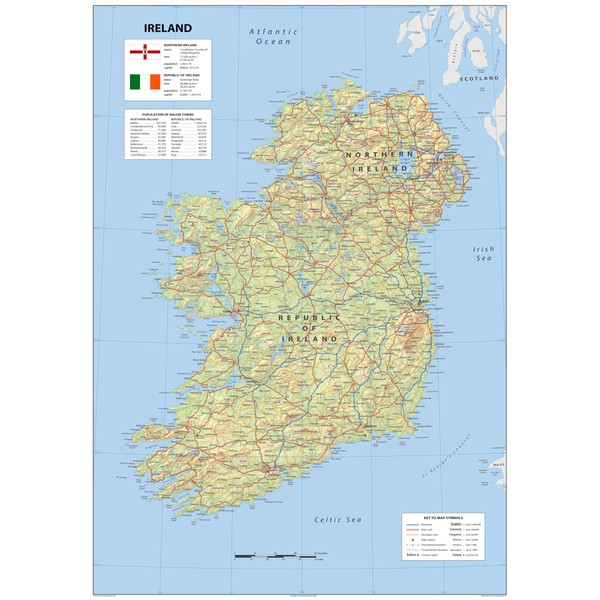- Our detailed physical poster map of Ireland boasts key attributes state lines, highways, and airports, as well as oceans, lakes. It is a perfect asset for classrooms and an exceptional resource for learning all that the country provides.