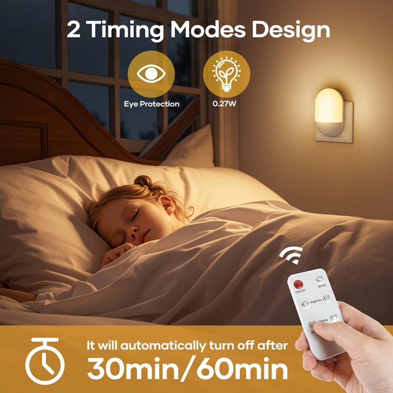 Detake 1 Stck LED Nachtlicht Steckdose fr Babys,Nachtlichter mit Fernbedienung, 3 Einstellbarer Helligkeit, 30/60 Timer-Funktion, warmen und kalten Lichtmodi fr Schlafzimmer, Flur, Kche
