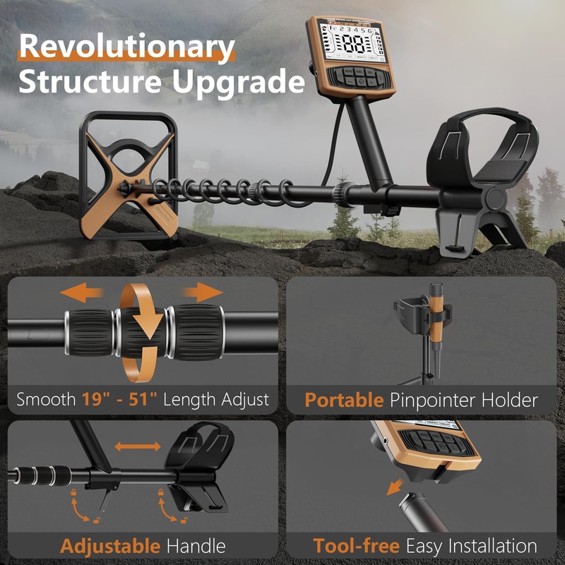 - Easy to install & use: The M55 lightweight metal detector has an upgraded collapsible cam lock design and screw-less main head to make assembly effortless. Equipped with a 2X larger backlit display for easy reading, silicone comfort buttons, and soft elbow support for one-handed operation. With the built-in on/off memory function, you don't need to reset the detector every time you start it