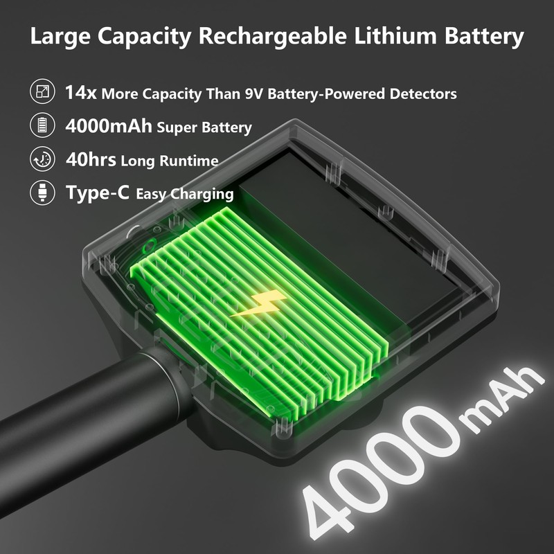 - 4000 mAh High Capacity Rechargeable Lithium Battery: Tired of disposable, low-capacity batteries? The M55 rechargeable metal detector for adults offers over 40 hours of continuous use on a single charge, ensuring you never miss out on treasure during long hunts. Conveniently charge with a universal Type-C connector using various methods: power bank, portable power station, power adapter, laptop/PC, or car charger