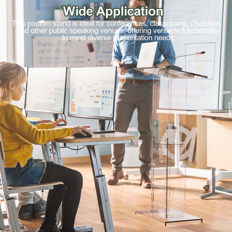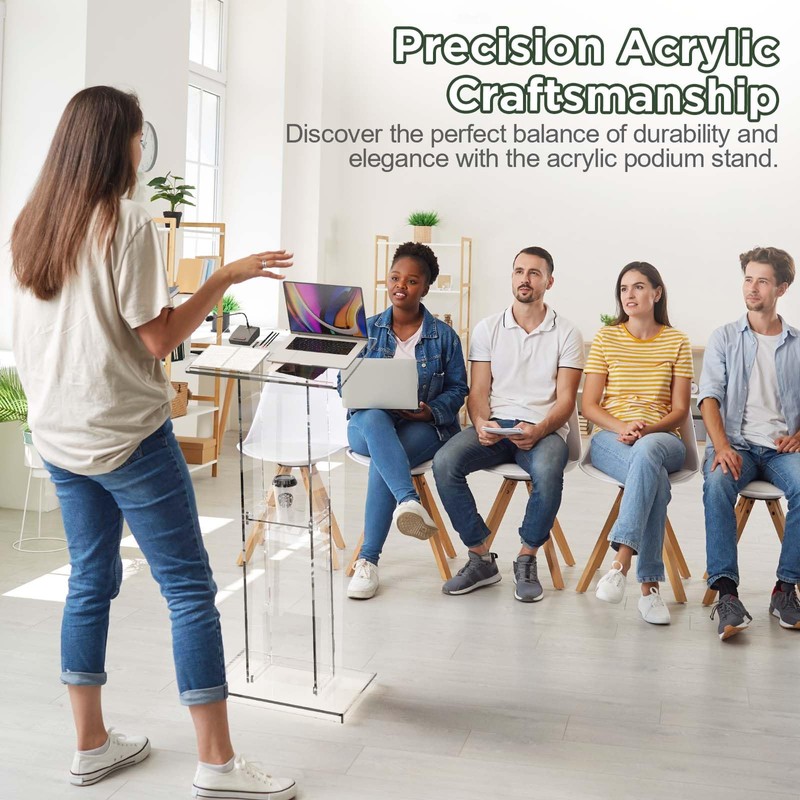 - Premium & Clear - Crafted from top-grade acrylic with a sturdy metal base, this sleek podium offers a spacious, transparent surface and integrated storage for all your essentials.