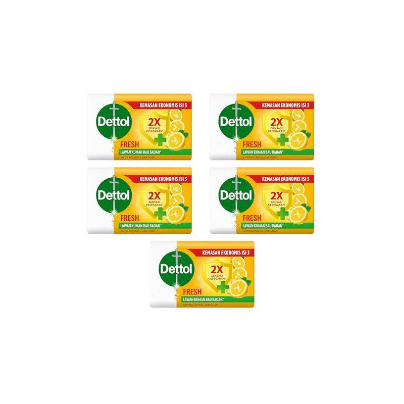 Power up your daily hygiene routine with Dettol Fresh Bar Soap – now with a refreshing citrus scent and trusted germ-fighting power. This convenient 5-pack features five 100g bars designed for long-lasting freshness and everyday use.