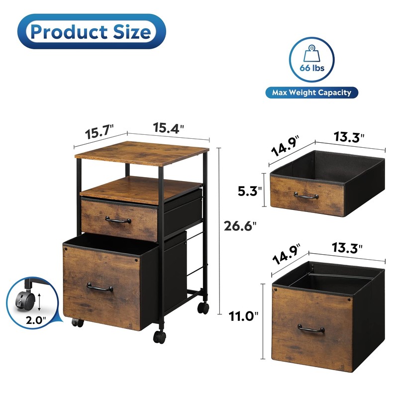 - Easy to Move: Rolling on 4 wheels, this mobile file cabinet can fix or move around your home office freely. Built-in brakes on front 2 casters to keep it in position and add stability. Unique fabric drawer design makes it only weigh 22 lbs. and light to move.