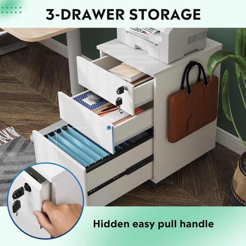 - LOCKABLE FILE CABINET: This 3-drawer file cabinet with 1 lock for first drawer, fits under most desks for home and office, keep your work space organized and neat.