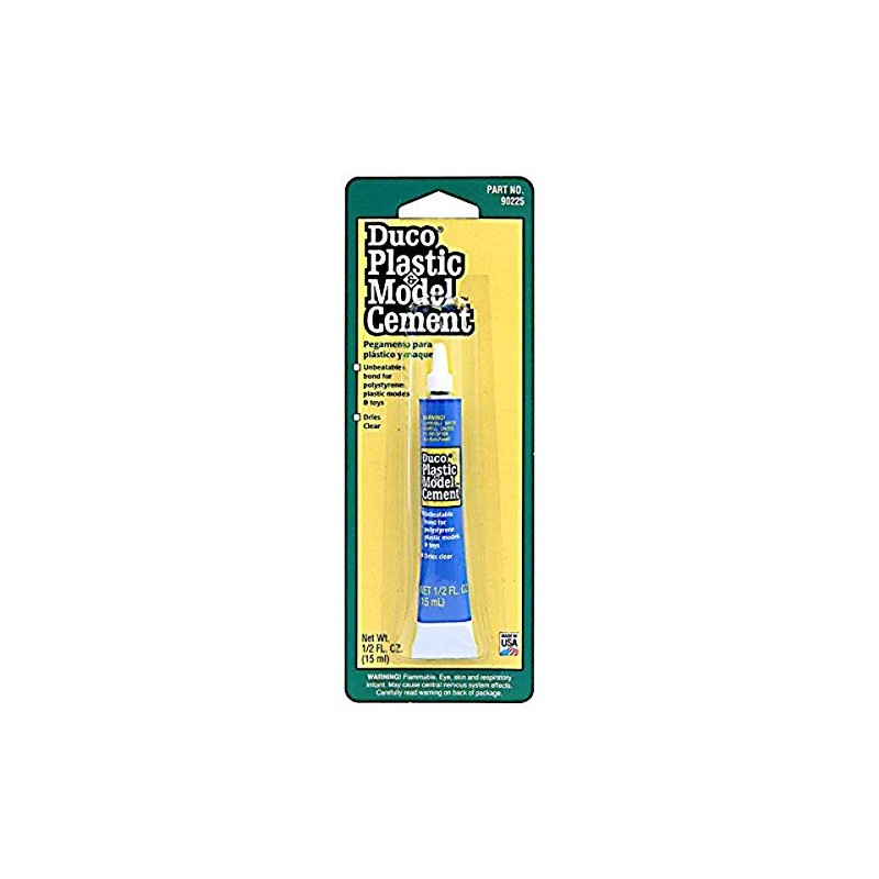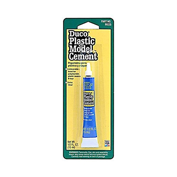 Devcon Duco Plastic and Model Cement is ideal for bonding polystyrene plastic models and toys. It is good to use removable tape on areas that you do not want the cement to get on. Before the cement cures, remove the tape. Flammable, keep away from heat, sparks and open flame. Dries clear, with a tensile strength of 300 PSI. Temperature Range: 200°F.