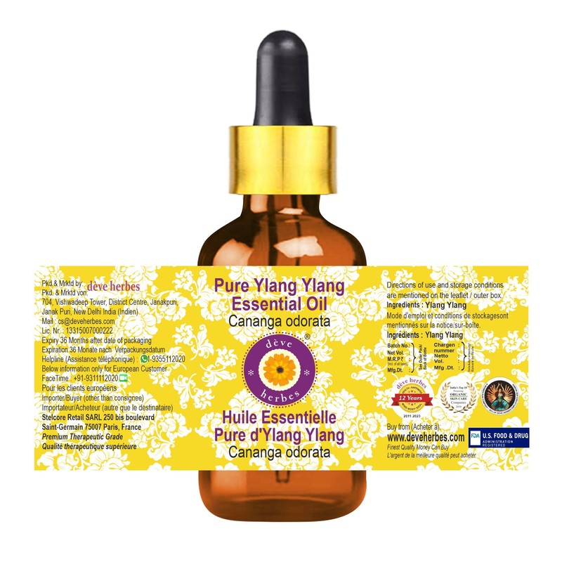 Deve Herbes Pure Ylang Ylang Essential Oil (Cananga odorata) with Glass Dropp...