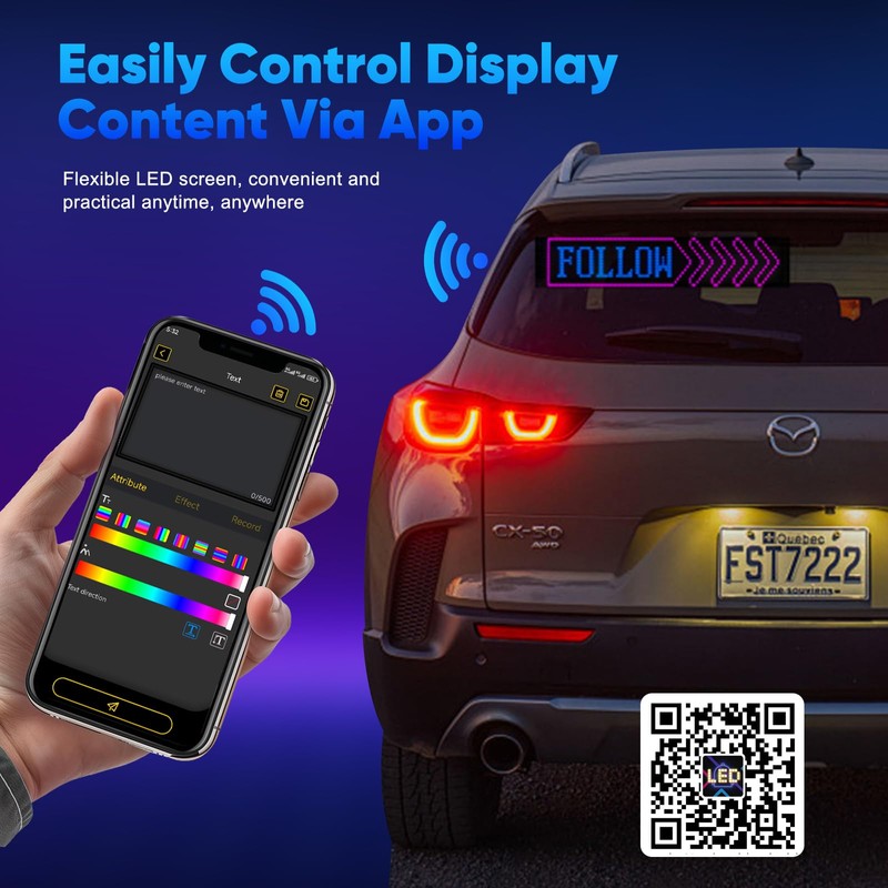 - Easy installation and high compatibility: the flexible LED display comes with a 4.5 metre long USB cable that allows you to power the sticker via the USB port of the vehicle or a power bank. With the included double-sided tape, the sticker is easy to apply to windows, walls or other flat surfaces. The app is compatible with both Android and iOS systems and allows easy operation