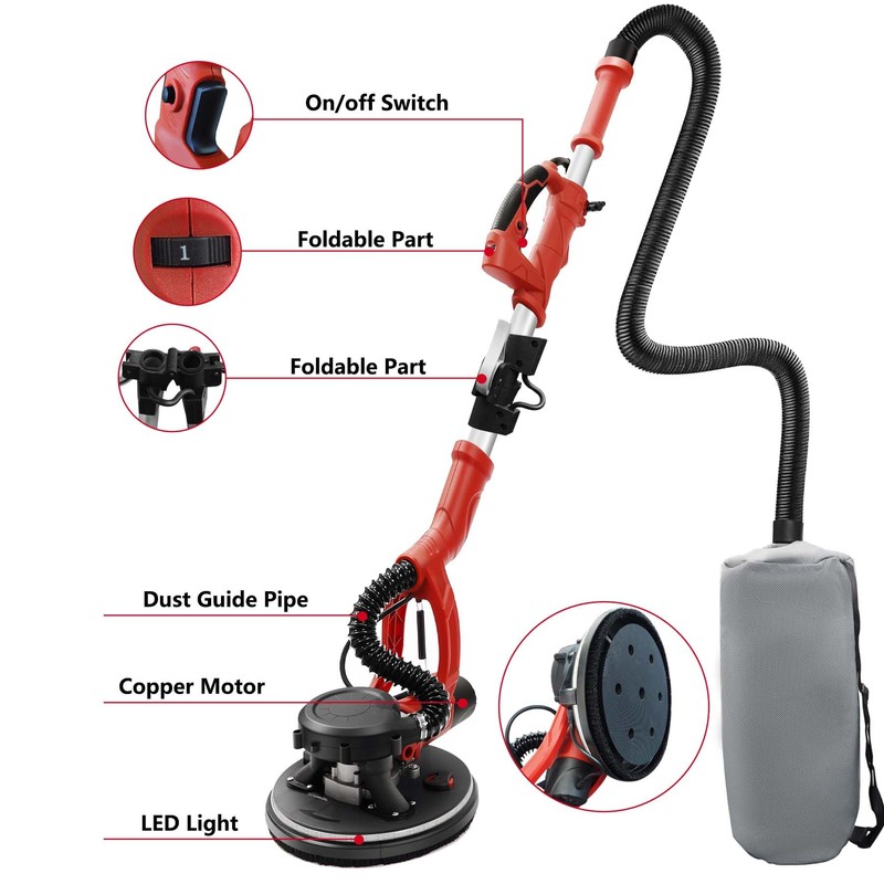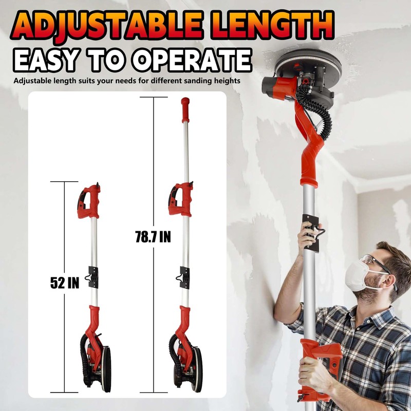 - Perfect for both tight storage spaces and variable working heights- Electric drywall sander with a foldable handle design is convenient for you to store when not in use, and the electric wall sander with a retractable extension rod design, which can be extended from 57 inches to 67 inches, to adapt to your needs when used at different heights.