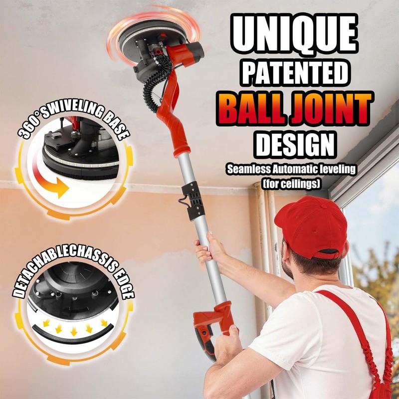 - No-Dead-Angle Sanding- This professional-grade drywall sander features a 9-inch 360° rotating sanding disc for smooth, even polishing across all surfaces—eliminating dead angles with its detachable base design.