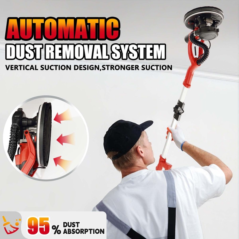 - AUTO DUST VACUUM SYSTEM- This professional drywall sander features high-efficiency vacuum dust collection that captures 98% of particles, drastically reducing airborne silica dust for a safer.The innovative 10-hole sanding disc and vertical suction system deliver superior dust extraction, while the 3-in-1 dust management system (ring cleaning brush + flexible hose + dust bag) ensures maximum debris collection. Whether you're a contractor or a DIY er, this sander keeps your work area dust-free and healthy—so you can focus on flawless results without the mess!Work smarter, breathe easier, and leave no dust behind!