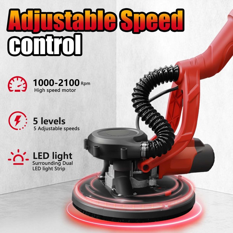 - POWERFUL COPPER MOTOR- Power Up Your Sanding Projects with Professional-Grade Tools.The devonic Drywall Sander features a 7.2A copper motor for strong, reliable performance, with 5-speed adjustment (1000-2100 RPM) to handle everything from smooth finishing to heavy material removal—perfect for drywall, ceilings, and floors.