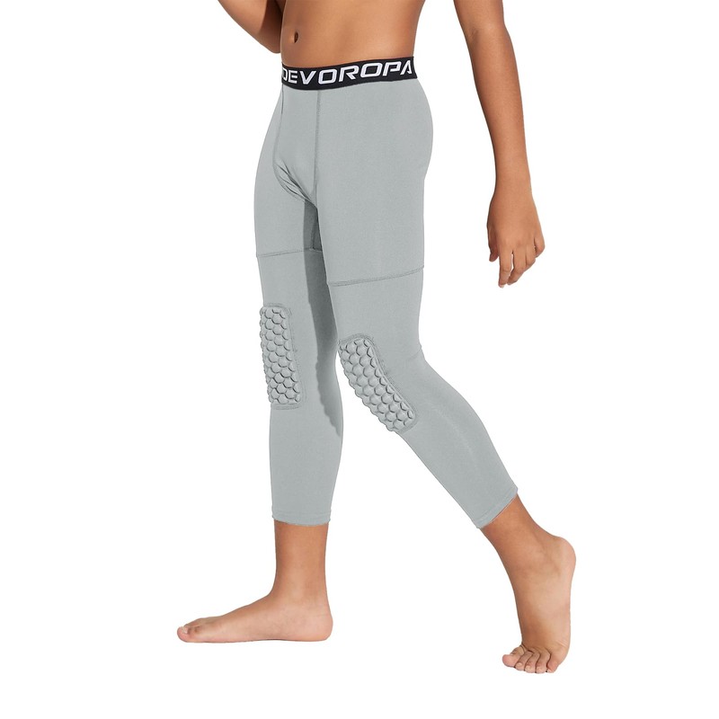 DEVOROPA Youth Boys' Compression Pants with Knee Pads 3/4 Basketball Athletic Tights Quick Dry Sports Workout Leggings Light Gray XL