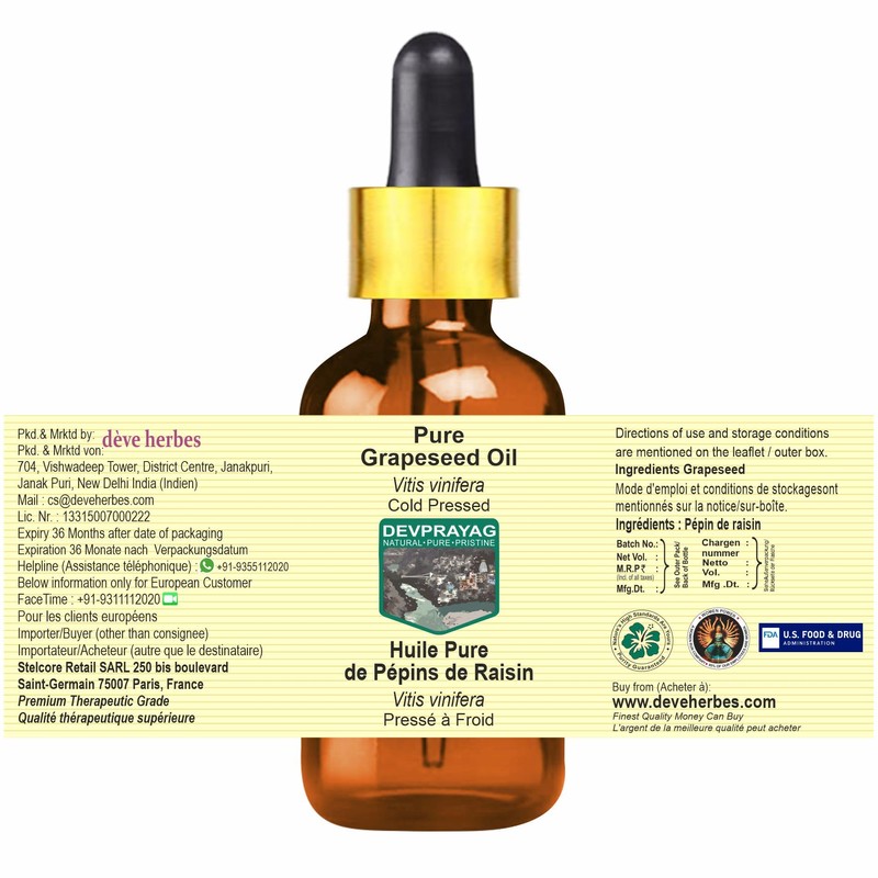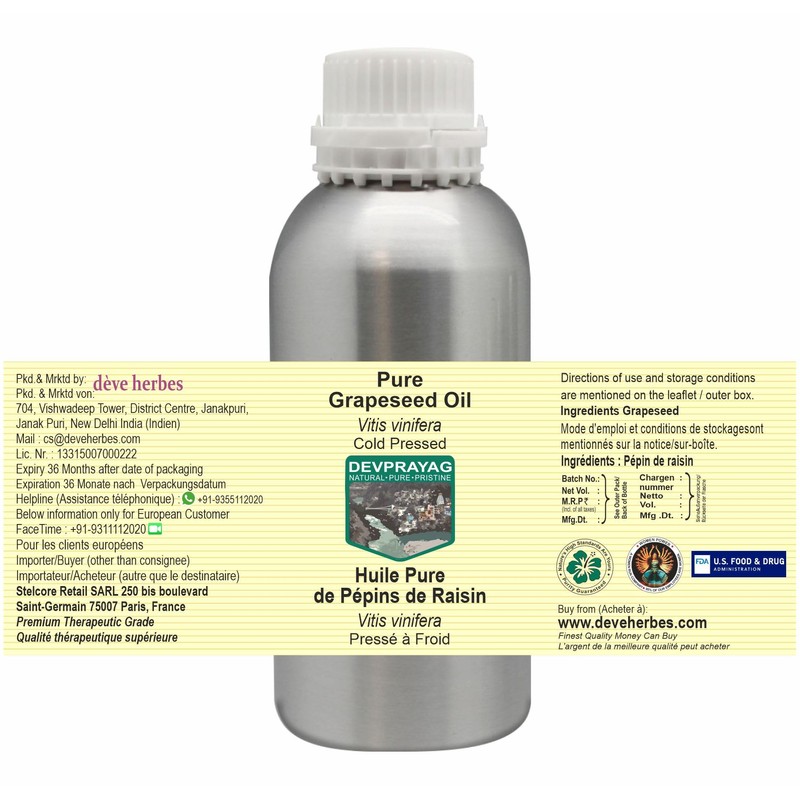 - Quantity - 630ml (21 oz) Container Type - High Quality Aluminium Bottle. Method of Extraction: Cold Pressed Botanical Name -Vitis vinifera, Pure, Natural, Undiluted, Therapeutic Grade Carrier Oil, Alcohol Free, Solvent Free, Vegan, Cruelty Free.
