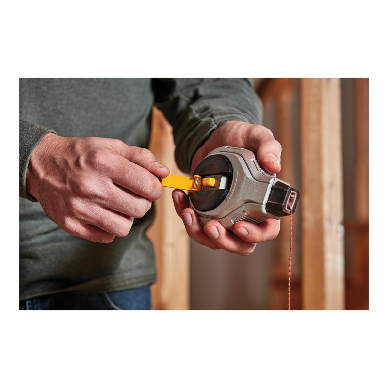 DeWALT 6:1 Chalk Reel 30m/100ft line clutch for smooth line release reduced jams extra-large flip cap easy refill 1/4 turn cap provides a secure fit Fitted with a nesting line hook for compact storage