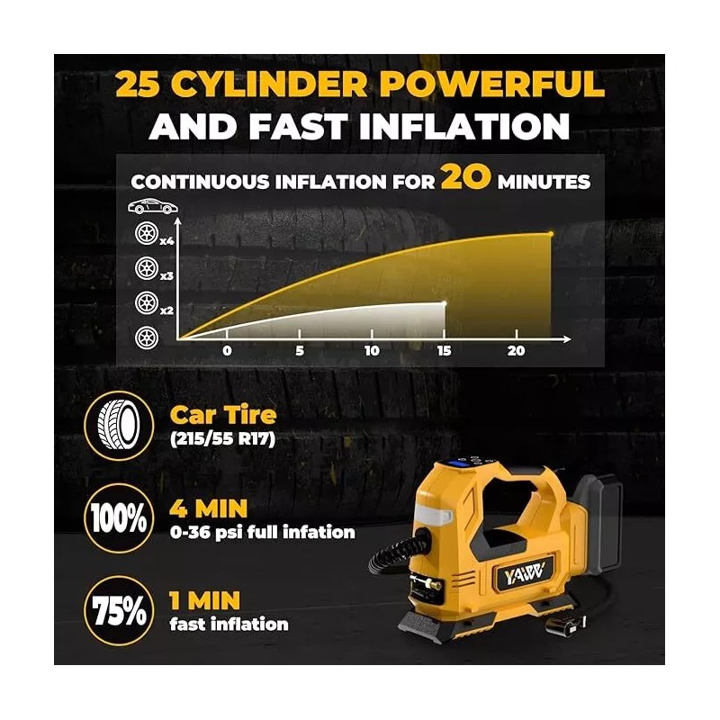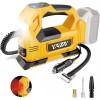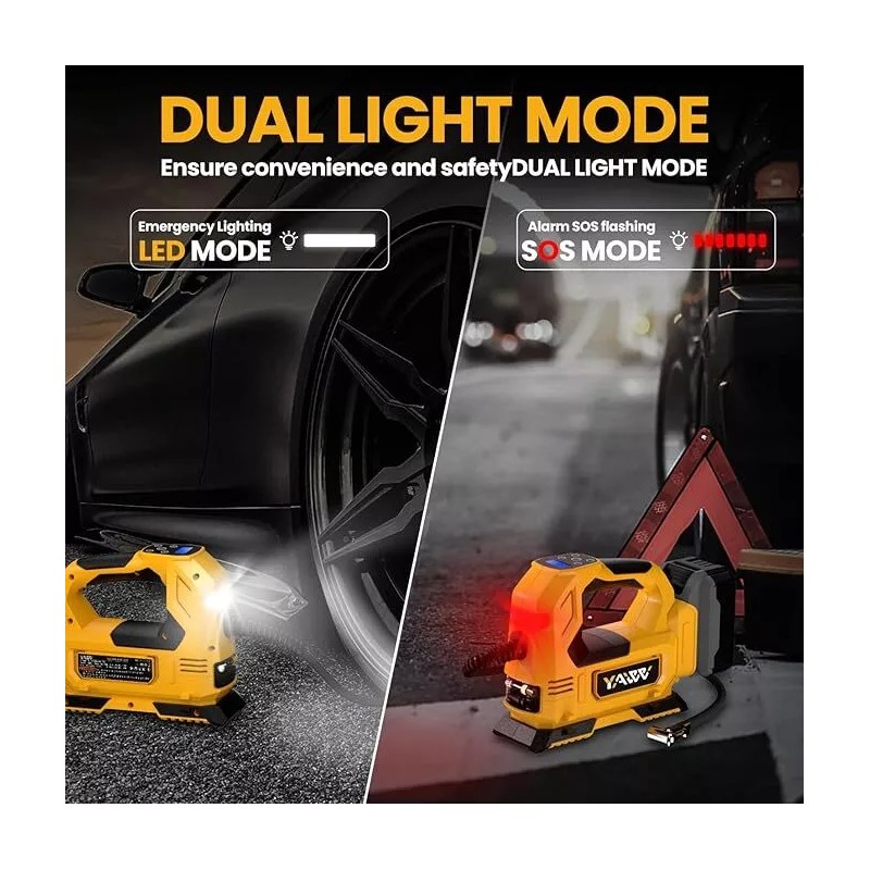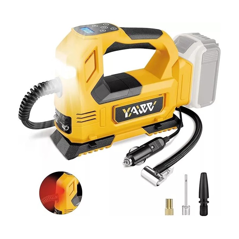 - Compatible with Dual Power: The YAWV portable air compressor is compatible with De-Walt 20V max Lithium Battery, powerstack battery, suitable for DCB203、DCB204、DCB206 and more. At the same time, our tire inflator comes with an 11FT long 12V car cigarette lighter plug and supports car power supply, which is perfect for use indoors and during travel.