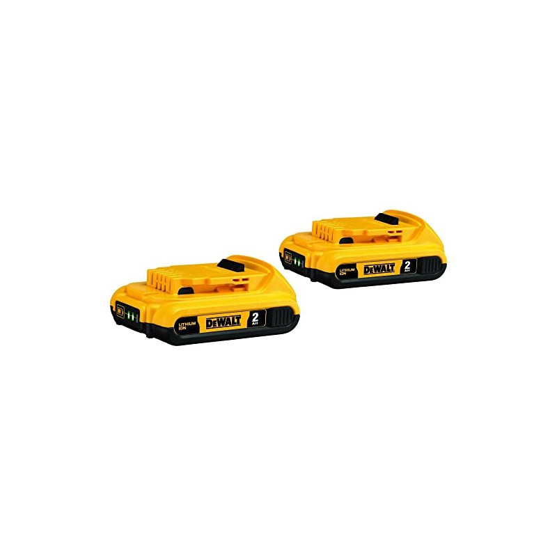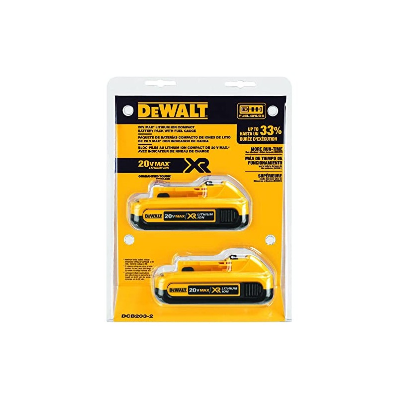 The DCB203-2 DEWALT 20V MAX* Battery, Compact Lithium Ion, 2-Pack has an extended run-time battery and provides immediate feedback on state of charge with the 3-LED Fuel Gauge System.
