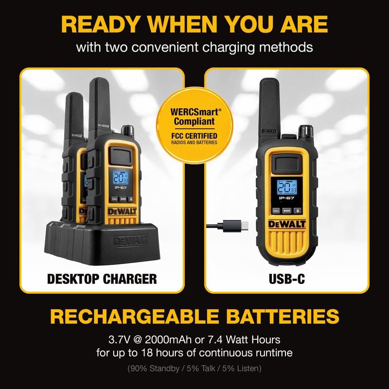 DEWALT heavy-duty walkie talkies are ideal for jobsites, contractors, and businesses. These reliable, feature-rich radios have ultra-clear long-distance reception and rugged durability that stands up to the elements. Stay in touch while on the job with secure, versatile talk that's guaranteed tough, with convenient accessories that power growing teams.