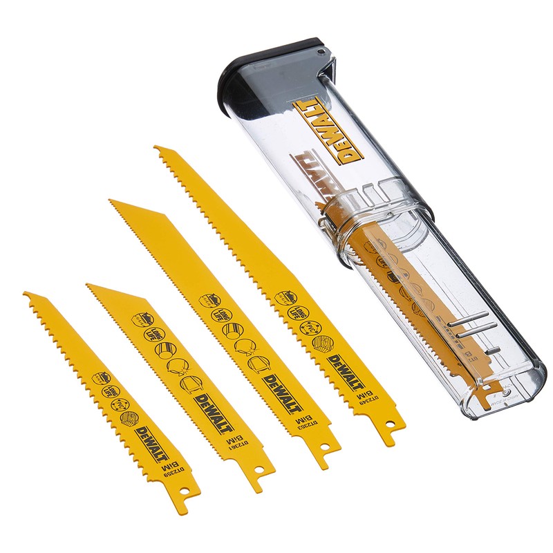 12 Reciprocating Saw Blades Set with Storage Case Set contains: 1 x DT2345 Bi Metal Saw Blade for Wood, Wood with Nails, Aluminium and fibre glass with immersion tip (152 mm, length 2.5 mm Tooth spacing) 3 x DT2349 Bi Metal Saw Blade for Wood, Wood with Nails, Aluminium and Plastic with immersion tip 228 mm Length, 4.2 mm Tooth spacing) 3 x DT2353 Bi-Metal Saw Blade for metal, Iron and pipework (203 mm Length, 1.8 tooth spacing) 3 x DT2361 Bi-Metal Saw Blade for metal, Iron and pipework 3 – 8 mm (152 mm Length, 1.8 tooth spacing) 2 x DT2359 QZ Bi-Metal Saw Blade for Wood, Wood with Nails – Plastic with immersion tip (152 mm Length, 4.2 mm tooth pitch)