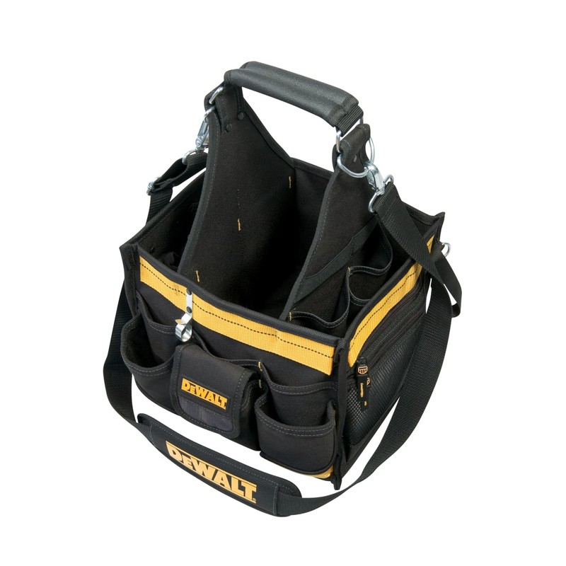 The DEWALT patented electrical and maintenance tool carrier has a box-shaped design and a large multi-compartment parts tray that stores conveniently beneath the main tool area, with 23 additional tool pockets, and a padded shoulder strap.