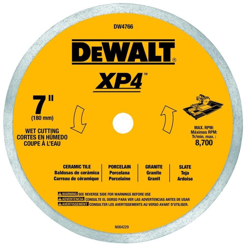 Dewalt DW4766 7-Inch Porcelain Tile Blade features an extended performance diamond matrix that provides long life and enhanced material cutting. The continuous rim design provides chip free cutting in all types of tile. The XP2 and XP4 blades designed specifically for high power tile saws, allowing quick, free, low heat, and straight cutting, while the XP2 and XP3 blades with laser cut expansion slots eliminate blade warping due to heat build-up. The premium XP2 and XP4 cutting matrix means XP2 gives 2 x's the life of standard blades, XP4 gives 4x's the life of standard blades.