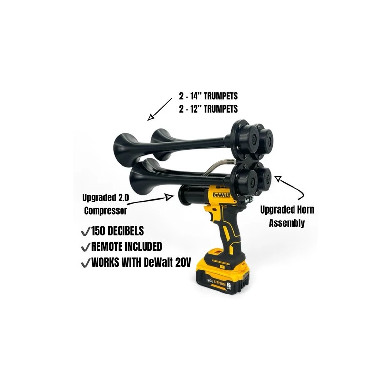 Whether you're using it for sporting events, graduations, political conventions, or any other outdoor activities, this train horn tool is sure to deliver the loud and distinctive sound you need. With its durable construction, easy-to-use features, the DeWalt Train Horn tool is the perfect choice for anyone who needs a reliable and powerful air horn. Get yours today and make some noise!