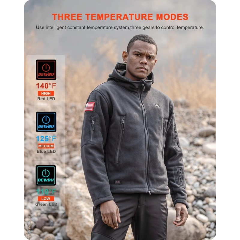 DEWBU Heated Jacket Polar Fleece with 12V Battery Pack Soft Fleece Electric Heating Hoodie for Men, Grey, XL
