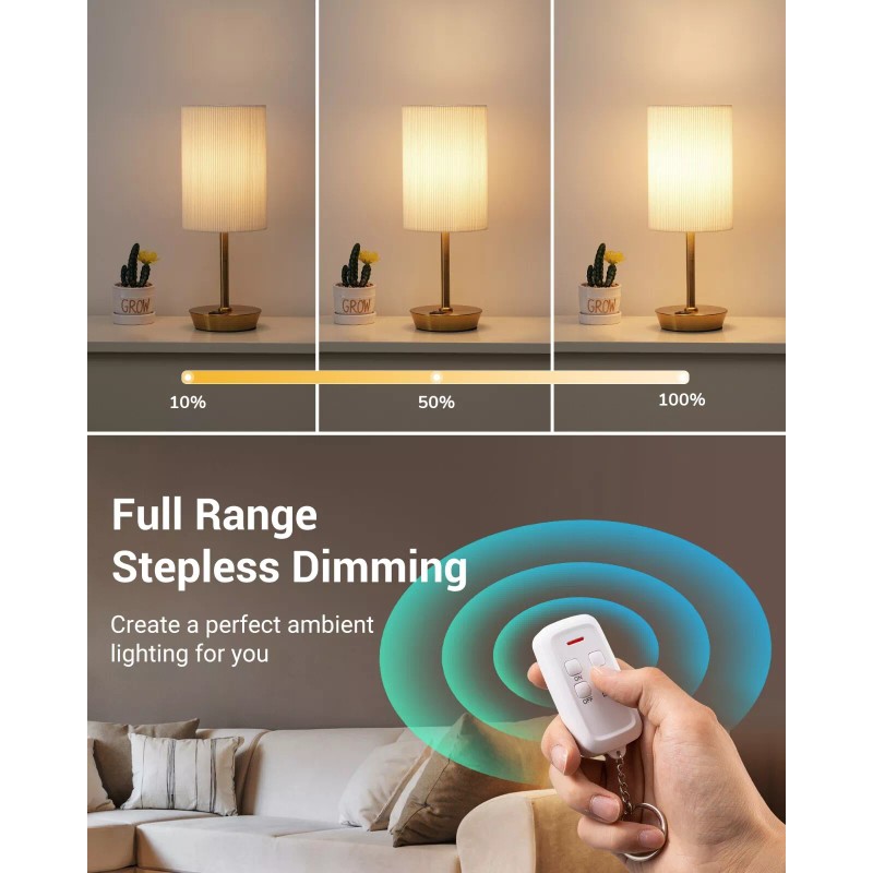 Adds approximately 1.97'' in height or lengthThe compact size is more convenient to install and will not affect the overall shape of your lamps. NOTE: Please measure the size carefully before you buy if you want to use it under lampshade or in tight space. | 100ft Remote Range - Stay away from dark spacesSignal Go Through Walls - Turn on garage or porch lights remotely. Do not need to be in the line of sight for remote to work.Strong radio frequency transmission can work through walls and doors to control lamp as far as 80’ in the open area. | Make Your Life Easier and ComfortableSimplify your life by remotely controlling your lights with a remote controller. Perfect for the elderly, pregnant woman and those with limited mobility or back pain; make your life convenient, safer, and energy efficient. |