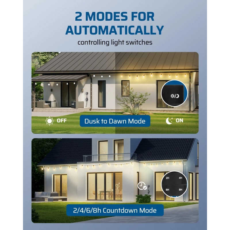 - [Outdoor Dimmer with Timer] This device combines the functionality of a dimmer and a timer, allowing you to adjust the brightness while offering convenient dusk-to-dawn mode and countdown options (2H/4H/6H/8H); perfect for tailored lighting control and energy savings