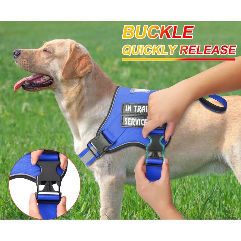 - EASY TO USE: This service dog vest set can quickly adjust the tightness of the neck strap and chest strap, and is equipped with a quick release buckle. All you need to do is put the dog harness around your puppy's neck, buckle it up, adjust the strap, and fasten the equipped dog leash to set off
