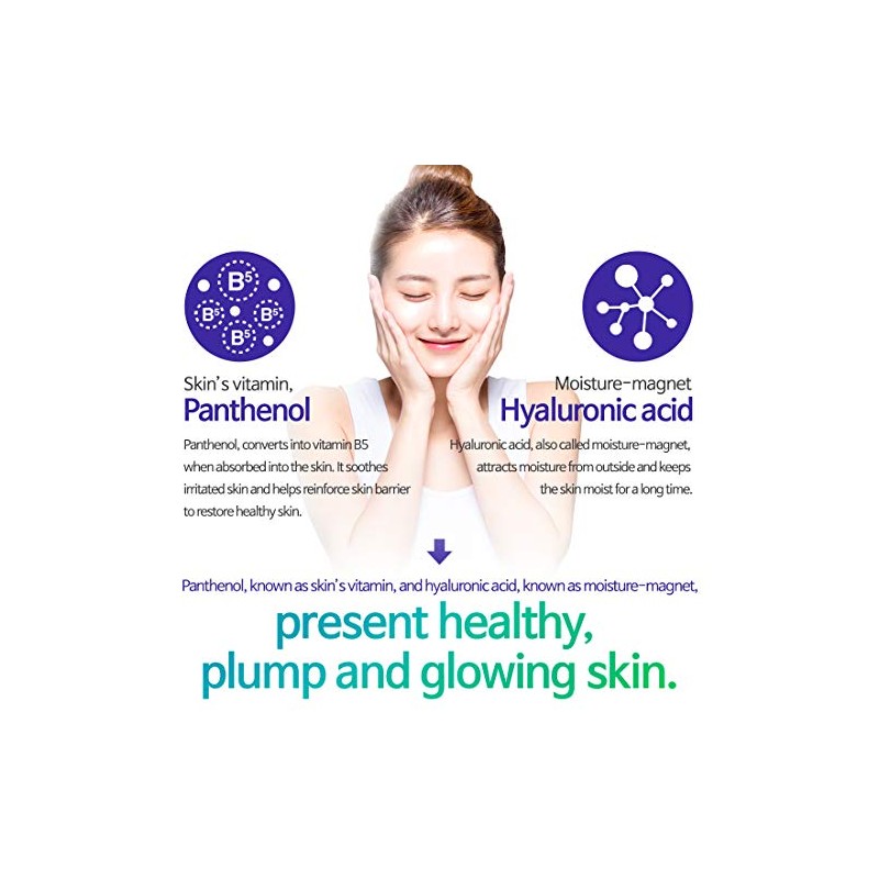 - Panthenol, known as skin’s vitamin, and hyaluronic acid, known as moisture-magnet, present healthy, plump and glowing skin.