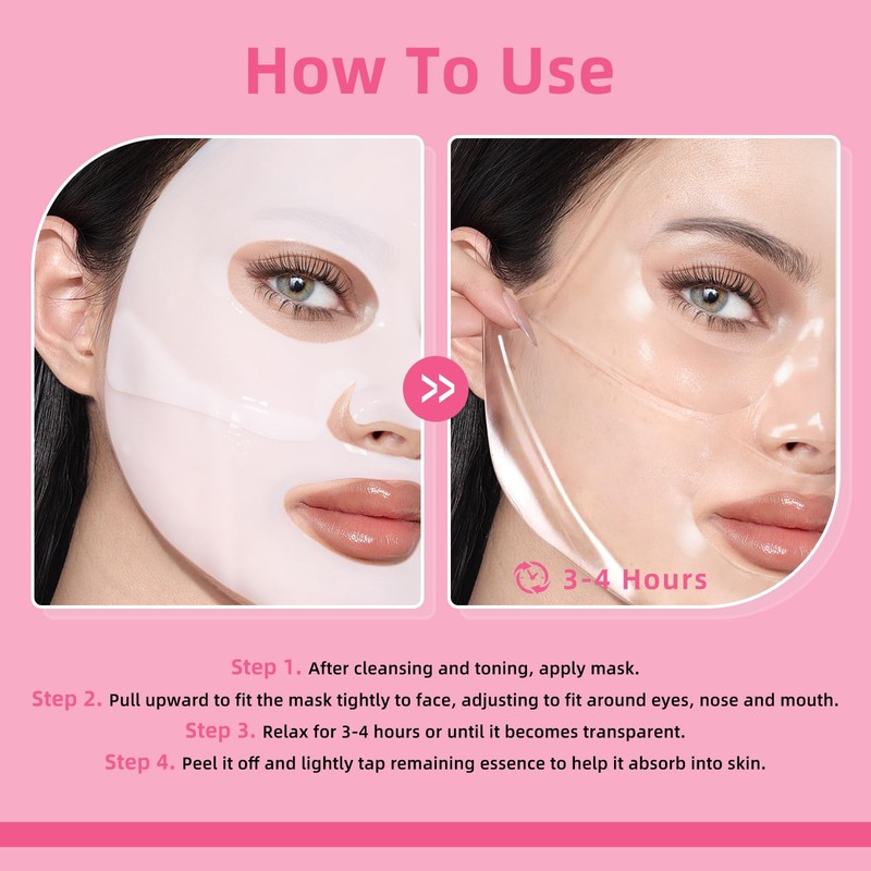 - OVERNIGHT MASK SHEET: After 3-4 hours, the collagen mask sheet fully absorbs into the skin, becoming transparent. This facial sheet mask can be used overnight, providing continuous care to enhance skin elasticity while you sleep. Enjoy smoother, firmer skin with minimal effort.