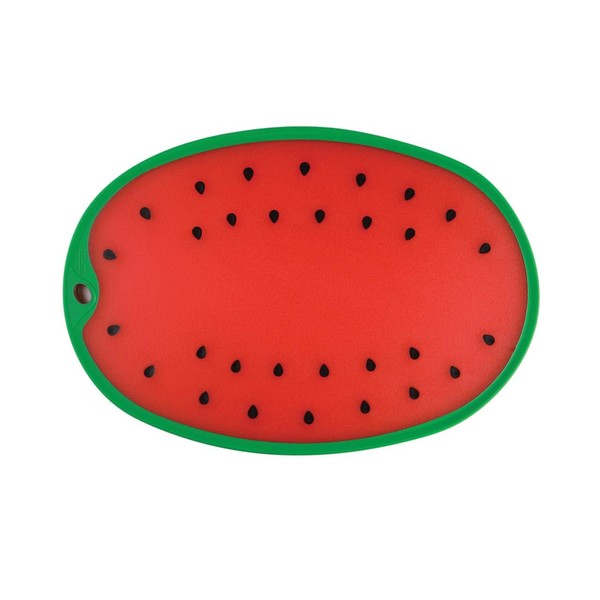 Prepare and serve fruits, vegetables, cheeses, and hor d'oeuvres on this watermelon shaped cutting board. The cutting board is made of propylene with a non- slip exterior edge. Cutting board is sturdy and will not slide or move during use, thanks to the non- slip edge. This reversible board can also be used as a fun bar or serving board. This board is reversible and both sides can be used for a variety of tasks. Dishwasher safe, hole in top for convenient storage.
