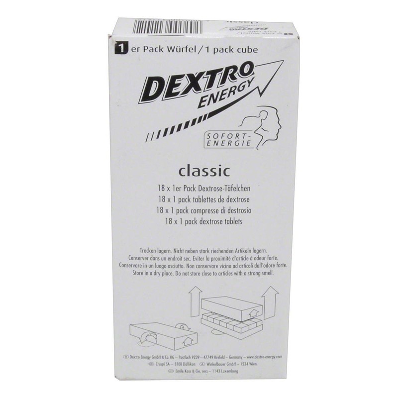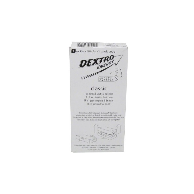 The Dextrose Classic cube from Dextro Energy contains the performance and concentration-promoting effect of dextrose. Dextrose goes directly into the blood, making it the fastest energy supplier. The fact that dextrose improves concentration and performance is not only evident in daily practice, but is proven by scientific tests. Energy-supplying dextrose panels. Ingredients: dextrose 89%, maltodextrin, magnesium carbonate, acidifier (citric acid), release agent (magnesium salts of fatty acids), aroma, vitamin C, vitamin B1, vitamin B6. Nutritional values per 100 g: energy 1562 kJ / 368 kcal fat. saturated Fatty acids 1 g 1 g carbohydrates of which sugar 91 g 82 g salt 0.1 g Storage and usage instructions: Store dry.