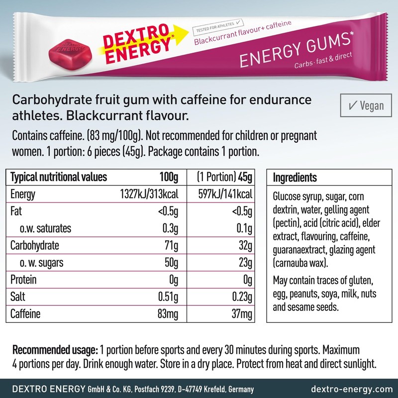 Dextro Energy | Energy Gums | Blackcurrant + Caffeine | Pocket Size Energy on the Go | For active lifestyle | Great taste | Vegan | 8 x 45 g