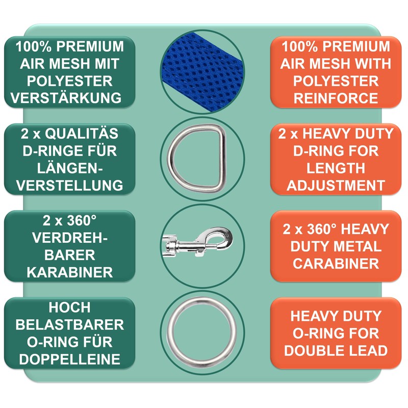 - Premium quality: the dog lead is made of 100% high-quality and durable premium air mesh. The material is characterised by its lightness and breathability. Thanks to the pleasantly soft Puffy Air mesh, the lead fits perfectly in the hand.