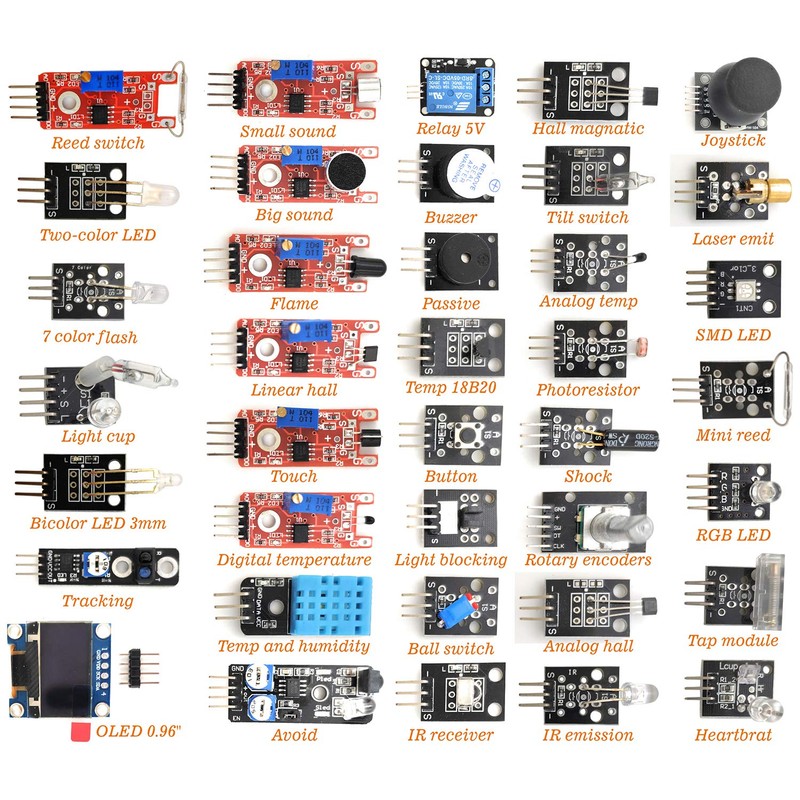- 38 sensor modules and 1 leaflet in a plastic box.
