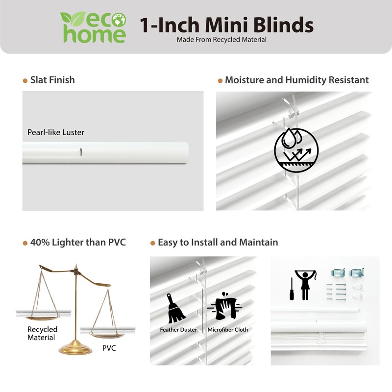 - Innovative Sustainability: Crafted from recycled materials, our blinds boast pearl-like luster finish. With durability & resistance to warping, fading, and sagging, perfect for humidity areas.The robust, flexible slats quickly recover their shape.