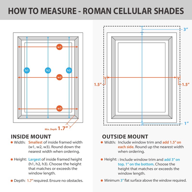 - Measurements: For inside mount, select width size that is 0.5" shorter than the width of your window recess. For outside mount, select width size that is a total of 6" wider than the outside width of your window frame. Installation hardware included.
