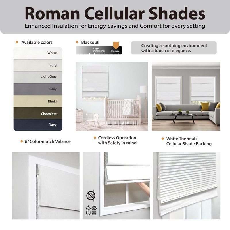 - Premium Quality: Cordless, light weight and simple to operate. Simply raise or lower the shade by hand. Our fabric roman shades are elegantly designed for a timeless look. Features a 6" color-match valance.