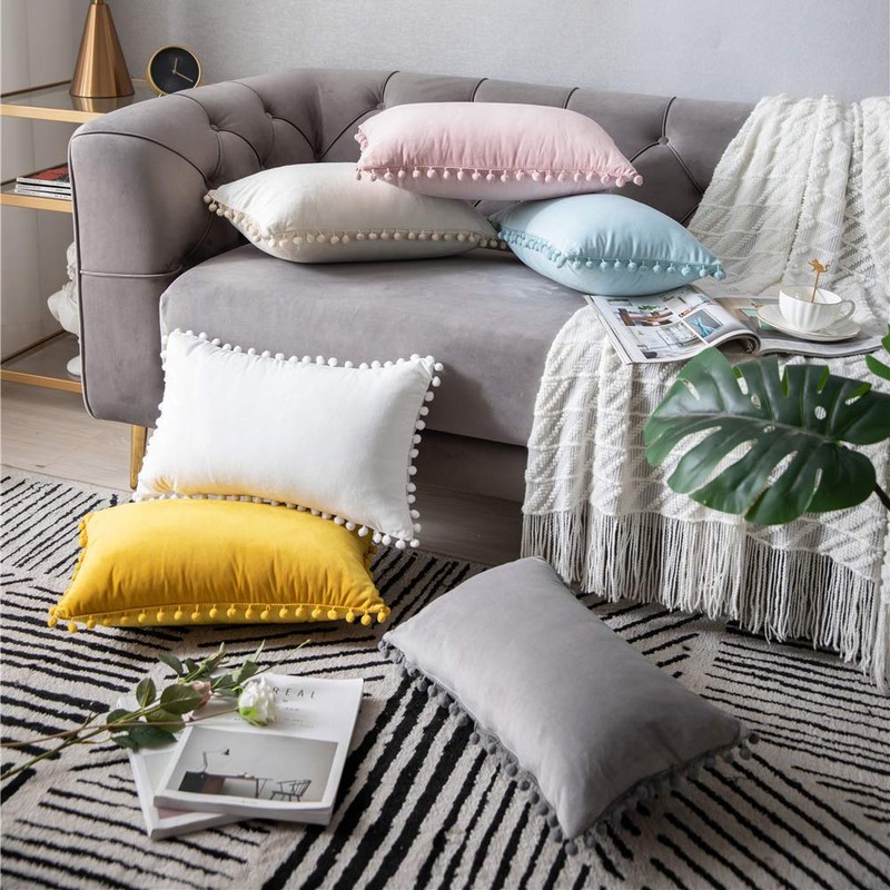 DEZENE 12x20 Throw Pillow Covers Pink: 2 Pack Cozy Soft Pom-poms Velvet Rectangular Decorative Pillow Cases for Farmhouse Home Decor