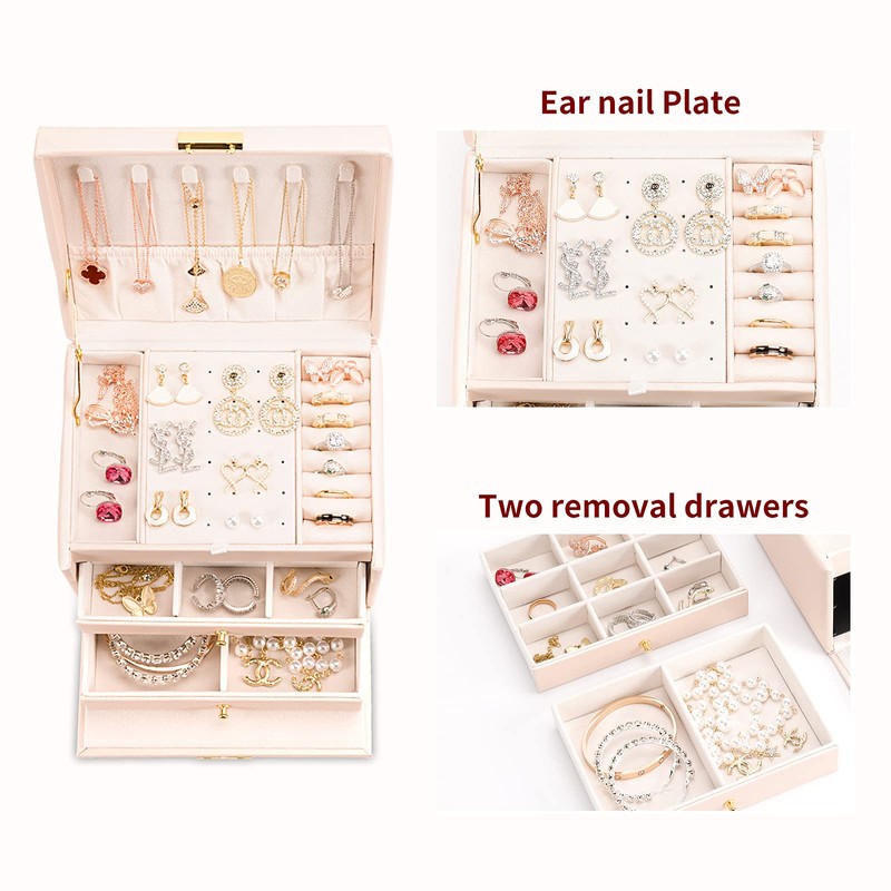 DEZZIE Women's Jewelry Box, Senior PU Leather, 3 Layer Medium Sized Jewelry Storage Box with Lock. Portable Travel Jewelry case for Earrings Bracelets Rings-Light pink