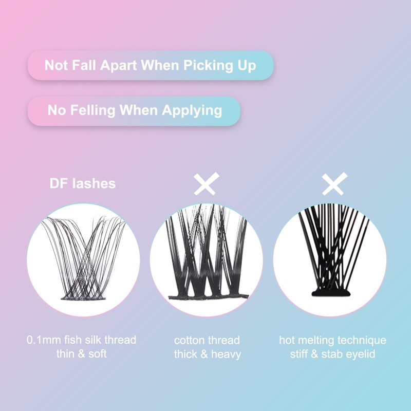 - No Felling When Applying: 0.1mm super thin lash band will not stab your eyelid when you apply and blink eyes. The eyelash band adopts the line closing technique instead of the hot melting technique, so the stem is softer than traditional individual lashes. At the same time, the cluster lashes will not fall apart when picking up from the strip or taking off from the eyes.