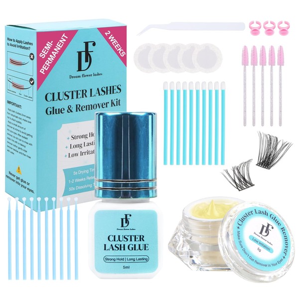 DF touchjoy Semi-Permanent Lash Cluster Kit with 2 Weeks Long Lasting Lashes Glue and Remover Natural Eyelash Clusters Strong Hold Waterproof Eyelashes Adhesive for DIY Lash Extensions with Supplies