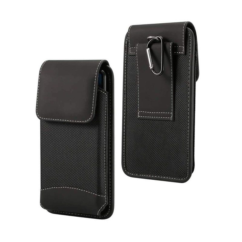 - Vertical belt cover with adhesive fabric closure for maximum security. With belt loop on the back, to attach to the waist or belt. And it also has a carabiner as a way of fastening, to hold your case safely at all times.