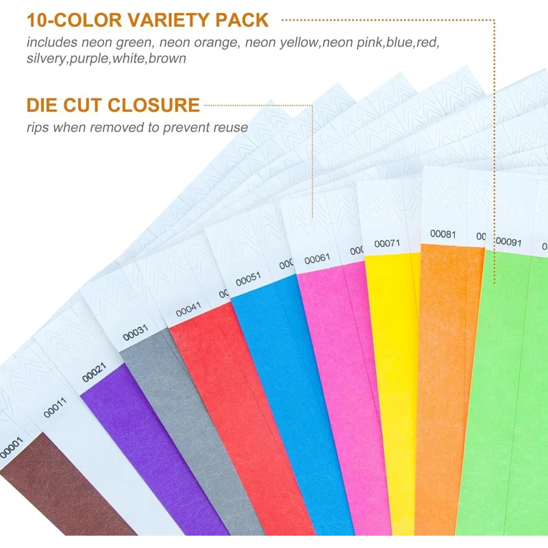 - Wristbands are 10" long and 3/4" wide. A piece of paper is 10 wrist straps. 100 wristbands have 1-100 consecutive numbers. 10 colors including white, brown, purple, silver, red, blue, neonpink, neonyellow, neonorange, neongreen.