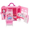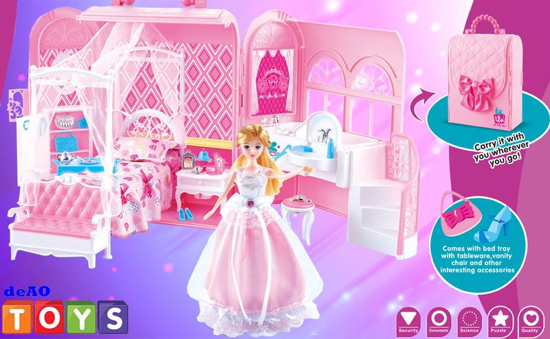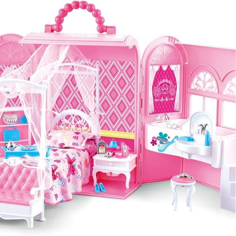 DH-PB - deAO 2-in-1 Pink Portable Carry Case Handbag and Dollhouse with Princess Deluxe Bedroom Furniture (Doll Not Included)
