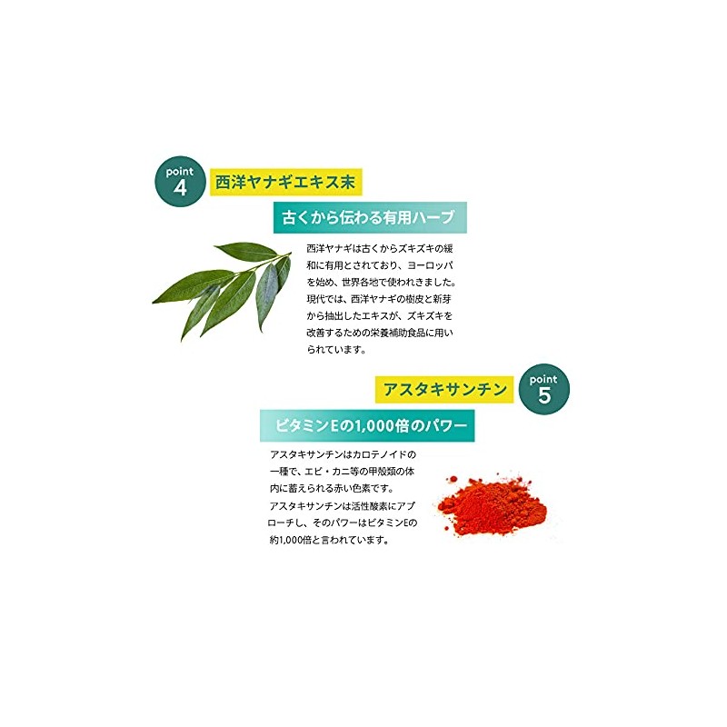 - 原材料(1日3粒あたり):キャッツクロウ(キャッツクロー)濃縮エキス末、フラックスシードオイル、精製魚油(DHA・EPA含有)、西洋ヤナギエキス末、カロテノイド、ヘマトコッカス藻色素、ビタミンB群、無臭にんにくエキス末、ミツロウ